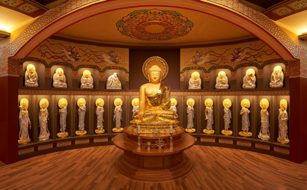 석굴암처럼 부처님의 배후에 십대제자와 감실 팔대보살, 대범천과 제석천을 배치하여 영산화상을 구현하였습니다. 이러한 구조는 부처님의 법인 이 법당에 살아 있음을 보이고, 전법으로 이 땅을 불국토로 만드는 것이 우리의 발원이라는 것을 보이고자 하는 것입니다.